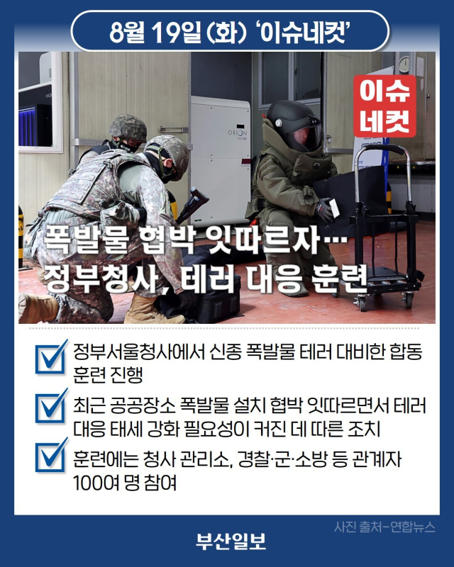 정부서울청사에서 신종 폭발물 테러에 대비한 합동 훈련이 19일 진행됐습니다. 최근 공공장소 폭발물 설치 협박이 잇따르면서, 정부 기관의 테러 대응 태세 강화 필요성이 커진 데 따른 조치입니다. 이날 훈련에서는 외교부 장관 앞으로 온 의심 택배에서 폭발물이 발견되는 상황을 가정해 훈련을 실시했습니다. 현장에서는 폭발물 제거와 유해 물질에 의한 사상자 구호 훈련도 병행됐습니다. 훈련에는 청사 관리소와 경찰·군·소방 등 관계자 100여 명이 참여했습니다.