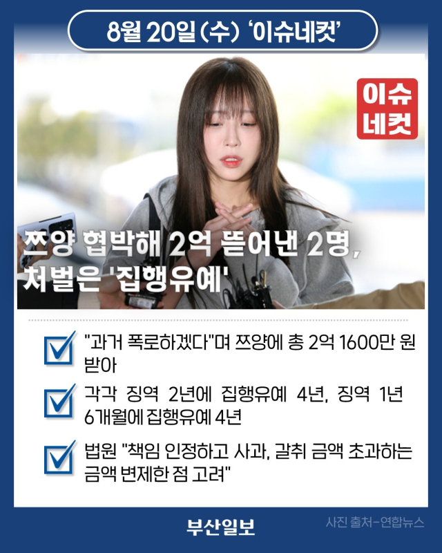 유튜버 쯔양(본명 박정원)을 협박해 2억여 원을 뜯어낸 혐의로 재판에 넘겨진 여성 2명이 징역형 집행유예를 선고받았습니다. 20일 서울중앙지법 형사12단독은 폭력행위처벌법상 공동공갈 혐의로 기소된 30대 여성 A 씨에게 징역 2년에 집행유예 4년을, 20대 여성 B 씨에게는 징역 1년 6개월에 집행유예 4년을 선고했습니다. 이들은 2021년 6월부터 2022년 11월까지 쯔양 측에게 "유흥업소에서 일했던 사실을 폭로하겠다"고 협박해 총 2억 1600만 원을 갈취한 혐의를 받습니다. A 씨는 2023년 사생활을 폭로하지 않는 조건으로 1500만 원을 추가로 달라고 요구한 혐의도 있습니다. 이와 관련해 쯔양은 지난해 7월 "3년 전에 전 소속사 대표(전 남자친구)가 이 여성 2명 이야기를 꺼내면서 '(여성들이) 협박하고 있다'고 했다. 내 돈으로 입을 막자고 했고, 어쩔 수 없이 PD님이 대신 나가 2명을 만나서 2년여간 2억 1600만 원을 주게 됐다"고 언급한 바 있습니다. 재판부는 "범행 기간이 길고, 갈취 금액이 많아 범죄가 불량하다"고 판시했습니다. 다만 "피고인들이 책임을 인정한 점, 수사 단계부터 대리인을 통해 사과 의사를 표시한 점, 피해자에게 갈취 금액에 초과하는 금액을 변제해 피해자와 합의한 점, 피해자가 처벌을 원하지 않는 점을 고려했다"고 양형 이유를 밝혔습니다.