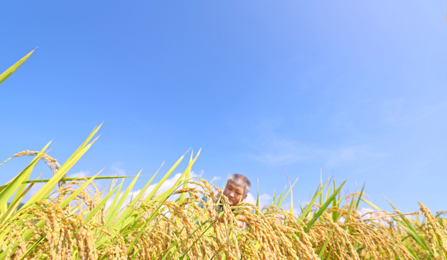 노랗게 익은 나락이 한껏 고개를 숙였다. 절기상 가을 시작을 알리는 처서를 나흘 앞둔 20일 경남 함양군 지곡면 덕암마을 들판에서 박철우 씨가 폭염에도 잘 익어가는 벼를 돌보고 있다. 함양군 제공