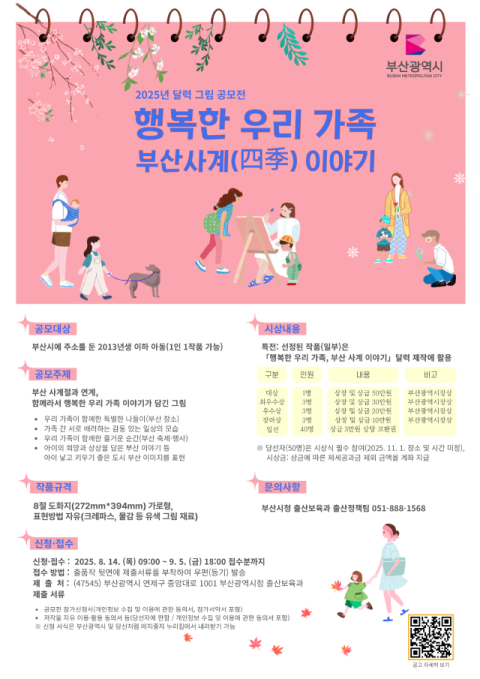 부산시(시장 박형준)는 오는 9월 5일까지 「행복한 우리 가족, 부산 사계(四季)이야기」 달력 그림 공모전을 개최한다고 밝혔다.
