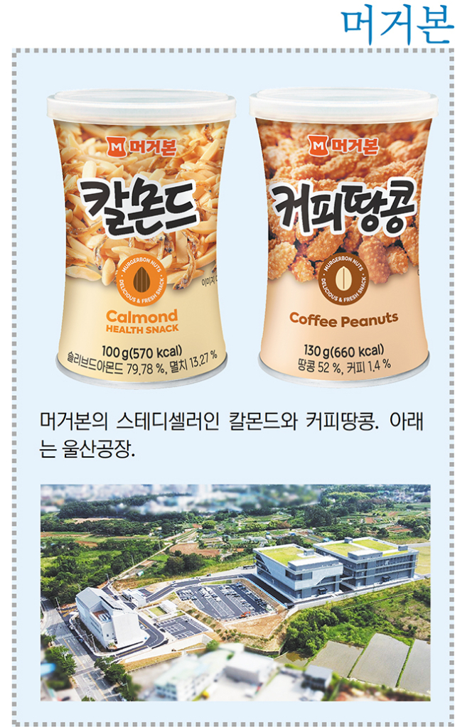 머거본은 부산 영도구에서 1986년 식품 관련 OEM 사업을 하다 2008년 머거본 브랜드를 출시했다. 머거본은 새로운 시도로 소비자들에게 인지도가 높다. 특히 1990년 초 국내에서 보기 어려운 ‘칼몬드’ ‘피스타치오’ ‘커피땅콩’ ‘꿀땅콩’과 같은 독특한 견과류 제품을 내놓기도 했다. 칼몬드는 멸치와 아몬드를 혼합한 제품이다.