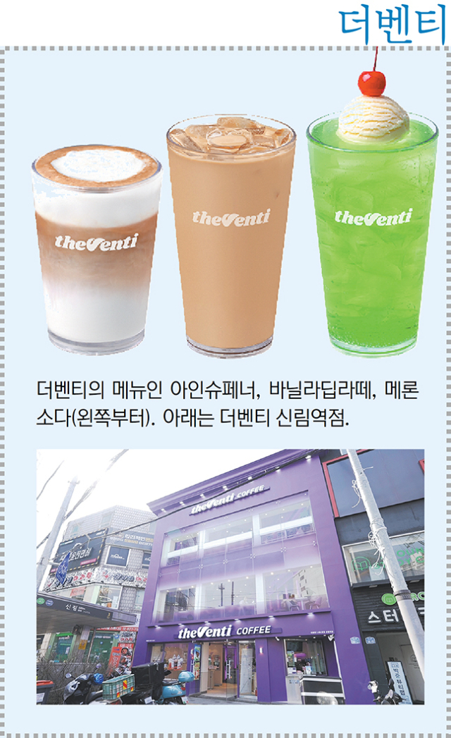 숫자만 보면 서울에서 시작한 브랜드 같지만 더벤티는 전국 최초로 부산대 앞에서 저가 커피 시장을 연 기업이다. 2014년 부산대 앞에서 벤티 사이즈의 아메리카노를 1500원이라는 파격적인 가격에 내놓았다. 그 덕에 더운 여름 ‘아아(아이스 아메리카노)’를 부담 없이 먹을 수 있게 된 셈. 부산대 1호점에서 시작한 더벤티는 올해 톱스타인 ‘지드래곤’을 모델로 쓸 수 있는 기업으로까지 성장했다.