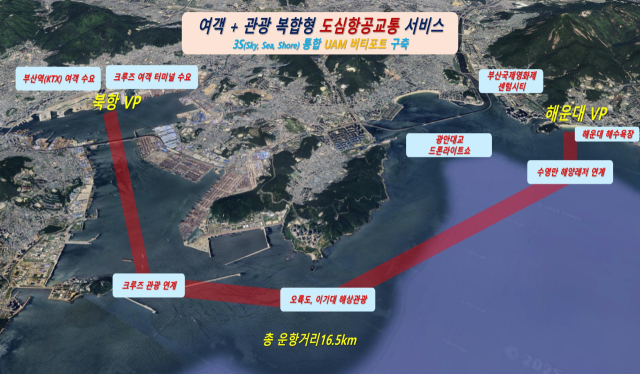 시는 이를 위해 북항 여객터미널과 해운대 송림공원에 버티포트를 만들 예정이다. 또 UAM을 타고 해안가로 이동하면서 오륙도·이기대를 둘러보고, 광안대교의 드론라이트쇼도 감상하는 등 다양한 관광 계획을 구상 중에 있다. 북항에서 해운대까지 총 운항 거리는 16.5km다.