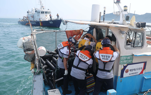 27일 오후 부산 수영만 요트경기장 인근 해상에서 열린 밀항·밀입국 국경 범죄 대비 합동훈련에서 부산해경이 의심 선박에 승선해 밀입국자를 제압하고 있다. 이번 부산해경, 육군 부산여단 합동훈련은 국경 범죄 대응력 강화와 경제사범들의 밀항 시도를 대비해 실시됐다.