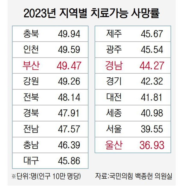 27일 국민의힘 백종헌 의원실이 보건복지부에서 받은 자료에 따르면, 2023년 부산 지역의 인구 10만 명당 치료가능 사망률은 49.47명이었다. 전국 17개 시도 중에서 세 번째로 치료가능 사망률이 높고, 전국 평균(45.36명)보다 높다.
