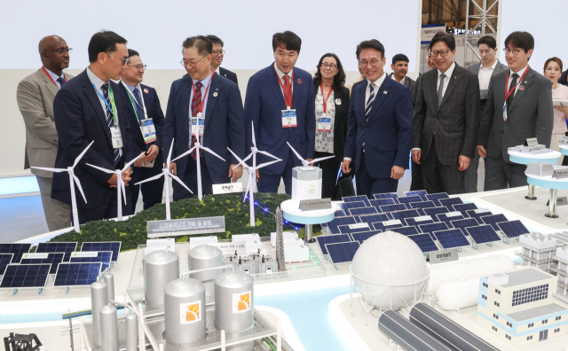 전 지구적 기후 위기 대응과 인공지능(AI) 확산에 따라 급변하는 에너지 산업의 미래를 미리 볼 수 있는 ‘2025 기후산업국제박람회’가 27일 부산 벡스코에서 개막했다. 김민석 국무총리와 박형준 부산시장 등 내빈들이 전시장을 둘러보고 있다.