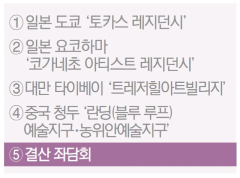 이 외에도 이날 좌담회에서는 일본 요코하마 트리엔날레 기간에 맞춘 코가네초 바자(bazaar)의 ‘통합 마케팅’ 사례나 대만 타이베이 THAV의 현지 프로그램에 의무 참여하는 ‘필드 트립’, 도쿄 토카스 레지던시가 작가뿐 아니라 연구자나 큐레이터를 선발해 일본 현지 작가와 연결하는 선발 트랙의 다양화 방안, 인플루언서 중견 작가를 영입해 신진 작가 및 유관 산업까지 두루 끌어들인 중국 청두 란딩예술구 이야기도 다시금 언급됐다. -끝-