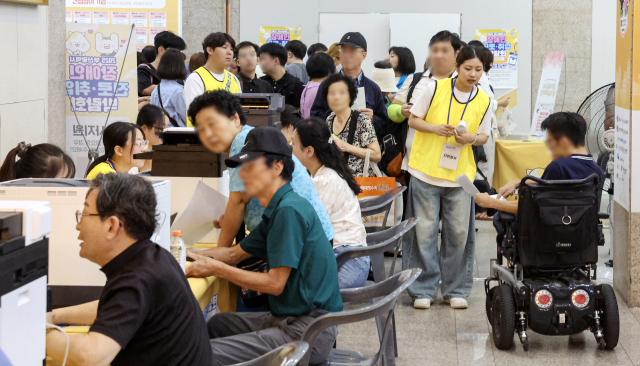 ‘2025 부산 장애인 진로·취업 박람회’가 열린 2일 행사장인 부산 연제구 부산시청 로비에서 구직자들이 취업 상담을 받고 있다. 부산시와 교육청이 공동으로 주최한 이번 행사는 사무직, 생산직, 서비스 직종에 구인을 원하는 54개 기업이 참여해 200여 명의 장애인을 채용할 예정이다.