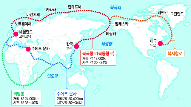부산에서 로테르담까지 기존 남방항로로 2만 2000km, 40일이 소요되는 반면, 북극항로로는 1만 5000km, 30일이 걸린다. 포트와치(PortWatch)에 따르면 2023년 11월 예멘 후티 반군이 홍해를 지나는 상선을 공격하기 시작한 이후 수에즈운하 대신 아프리카 희망봉을 4000km 이상 둘러가는 선박이 급격히 늘었다. 2023년 2월 1170척이던 희망봉 우회 선박은 2024년 8월 2887척으로 늘었다.