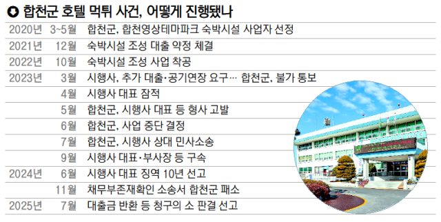 속보=합천영상테마파크 호텔 조성사업 시행사 대표의 사업비 횡령·배임으로 거액의 빚을 떠안게 된 합천군(부산일보 8월 6일 자 10면 등 보도)이 금융기관과의 소송을 마무리했다. 협의 끝에 시공사와 대출원리금을 공동 변제한 건데, 사업이 중단된 지 2년 만이다.