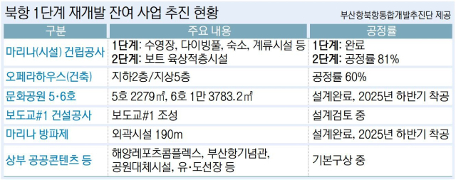 북항 1단계 재개발구역은 이미 부분 준공한 도로·항만시설·공원 등 기반시설 외에 문화공원, 보도교#1, 마리나 방파제 등 잔여 기반시설 공사가 남아 있다. 행정안전부에서 추진 중인 공공청사도 올해 하반기에나 착공할 예정이다. 현재 여건상 북항 1단계 재개발사업은 사업 시한인 2027년 말까지 이들 사업들을 마무리 짓기에는 시간이 빠듯하다는 게 중론이다.