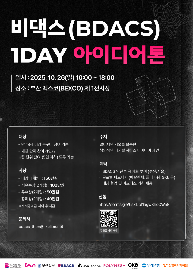 블록체인 커스터디 전문기업 비댁스(BDACS)는 오는 10월 26일 부산 벡스코 제1전시장에서 ‘비댁스 1DAY 아이디어톤’을 개최한다고 16일 밝혔다. 이번 행사는 창의적인 멀티체인 기반 디지털 서비스 아이디어를 발굴하고, 부산 지역 블록체인 생태계의 활성화를 도모하기 위한 취지로 마련됐다. 서울에 집중된 기존 블록체인 행사와 인재 쏠림 현상을 해소하고, 부산 블록체인특구의 실질적인 성장 동력을 확보하겠다는 전략이다.