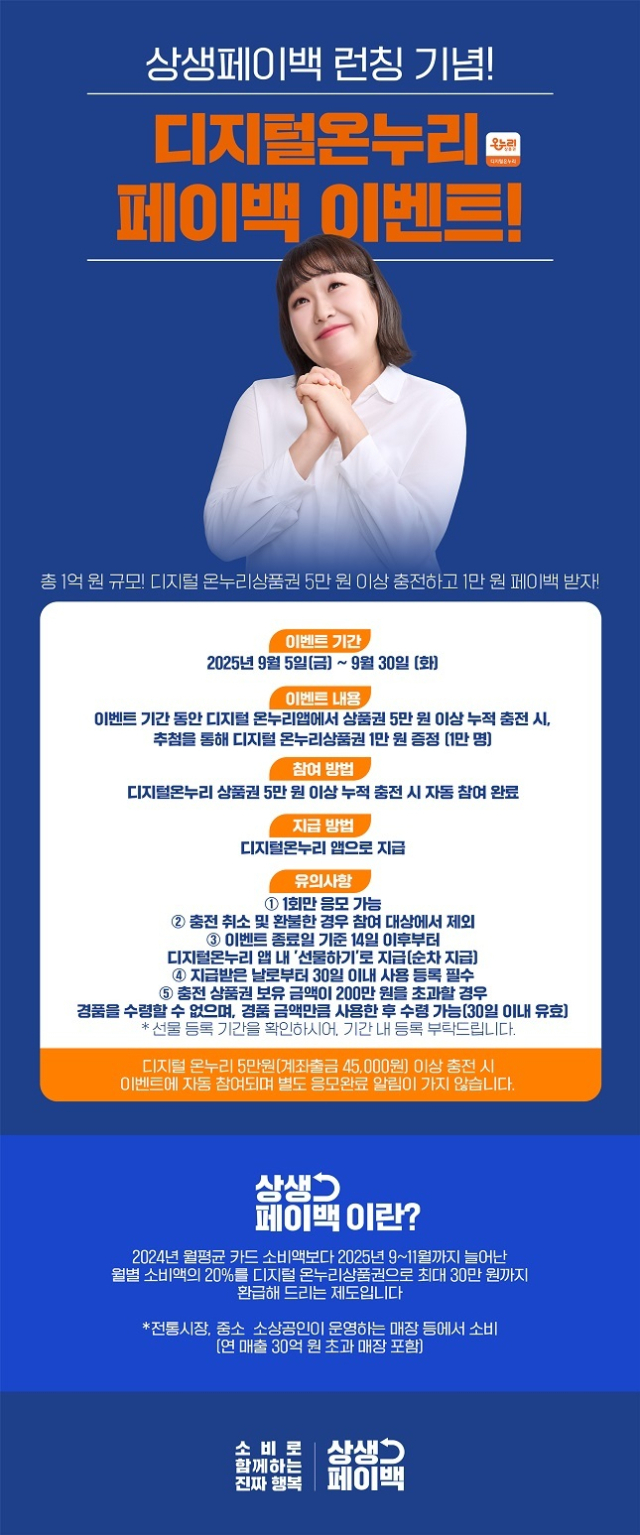 아울러 상생페이백 런칭 기념으로 이달 30일까지 디지털 온누리 앱에서 상품권을 누적 5만원 이상 충전하면 추첨을 통해 1만원의 상품권을 총 1만명에게 지급한다.