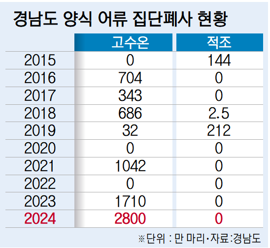 경남에서만 누적 폐사량이 200만 마리에 육박했다. 지금 추세라면 2019년을 넘어 최근 10년 내 최악의 떼죽음 피해가 기록될 수 있다는 우려도 나온다.