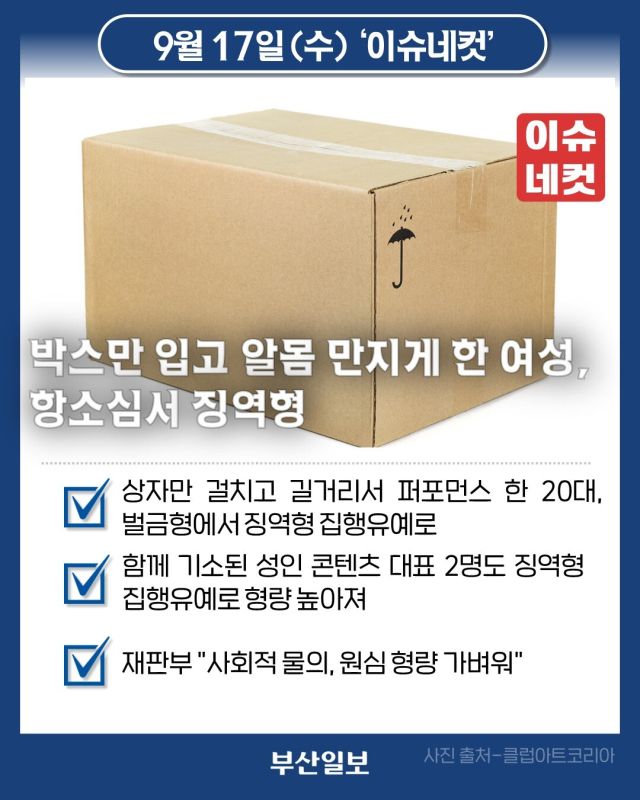길거리에서 알몸에 상자만 걸친 채 행인들에게 자기 몸을 만지도록 한 20대 여성이 항소심에서 징역형을 선고받았습니다. 17일 서울중앙지법 형사항소2-2부는 공연음란 혐의로 기소된 A 씨에게 벌금 400만 원을 선고한 원심의 판결을 깨고 징역 8개월에 집행유예 2년을 선고했다고 밝혔습니다. 40시간의 성폭력 재범 예방 강의 수강도 명령했습니다. 함께 기소됐다가 벌금형을 선고받았던 성인 콘텐츠 제작사 대표 2명도 각각 징역 10개월에 집행유예 2년, 징역 1년에 집행유예 2년을 선고받았습니다. 이들은 지난 2023년 10월 서울 압구정과 홍대 등 번화가에서 행인들에게 상자 안에 들어간 A 씨의 신체를 만지게 한 혐의를 받습니다. 이 장면은 영상으로 촬영돼 SNS에 업로드되면서 큰 화제가 된 바 있습니다. 재판부는 "검사가 형이 약하다고 항소했고, 피고인 자신도 알 것"이라며 "언론에도 나왔고 사회적으로 물의를 빚은 점 등을 비춰보면 원심의 형이 낮다고 할 수 있어서 1심을 파기하고 새롭게 형을 정했다"고 설명했습니다. 한편 A 씨는 마약류인 케타민을 구입한 혐의(마약류 관리에 관한 법률 위반)로도 재판에 넘겨져 현재 서울중앙지법에서 1심이 진행 중입니다.