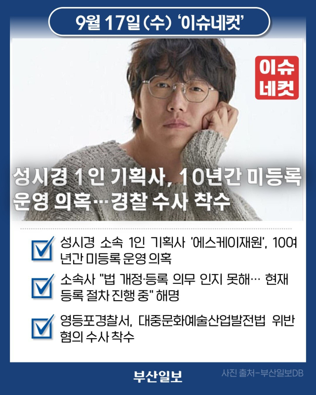 가수 성시경 씨가 속한 1인 기획사가 10여년간 미등록 상태로 운영됐다는 의혹에 대해 경찰이 확인에 나섰습니다. 전날 한 언론사는 성 씨가 소속된 '에스케이재원'은 그의 누나가 대표이사인 1인 기획사로, 문화체육관광부에 대중문화예술기획업 등록이 되지 않은 업체라고 보도했습니다. 2014년 7월부터 시행된 대중문화예술산업발전법에 따르면 법인과 1인 초과 개인사업자로 활동하고 있는 연예인은 대중문화예술기획업으로 등록해 활동해야 합니다. 이를 어기고 등록하지 않고 영업을 하는 행위 자체로 2년 이하의 징역 또는 2000만 원 이하의 벌금형에 처해질 수 있습니다. 이에 소속사 측은 입장문을 내고 "2011년 2월 법인을 설립했으나 2014년 1월 대중문화예술산업발전법이 제정돼 대중문화예술기획업 등록 의무가 신설됐음을 인지하지 못했다"고 해명했습니다. 이어 "사실을 인지한 즉시 등록 절차를 진행 중"이라며 "조속히 모든 절차를 마무리하고 법적 요건을 충실히 이행할 수 있도록 최선을 다하고 있다"고 전했습니다. 국민신문고로 성 씨의 대중문화예술산업발전법 위반 고발 사건을 넘겨받은 영등포경찰서는 성 씨의 사건에 대한 수사에 착수했습니다.