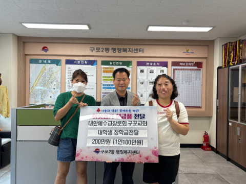 부산 북구 구포2동 행정복지센터(동장 강명석)는 18일 구포교회에서 기탁한 장학금을 대학생(1학년) 2명에게 1인당 100만 원씩 전달했다고 밝혔다.