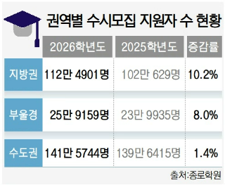반면 수도권 대학은 지원자 증가폭이 크지 않거나 오히려 감소한 곳도 많았다. 서울권 대학은 전년보다 1만 8818명(2.1%) 증가했고, 경기·인천권은 511명(0.1%) 증가하는 데 그쳤다. 서울권 42개 대학 중 20곳(47.6%), 경기·인천권 40개 대학 중 17곳(42.5%)은 오히려 지원자가 줄었다. 지방권에서는 110개 대학 중 지원자 감소 대학이 16곳(14.5%)에 불과했다.