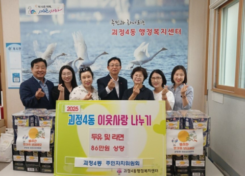 부산 사하구 괴정4동 주민자치위원회는 지난 19일 행정복지센터에 이웃돕기 성품으로 86만 원 상당의 두유와 라면을 기탁했다.