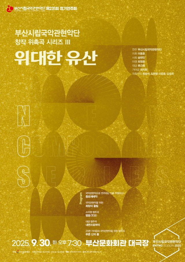 부산시립국악관현악단은 오는 30일 제231회 정기연주회 창작위촉곡 시리즈 Ⅲ ‘위대한 유산’을 무대에 올린다.