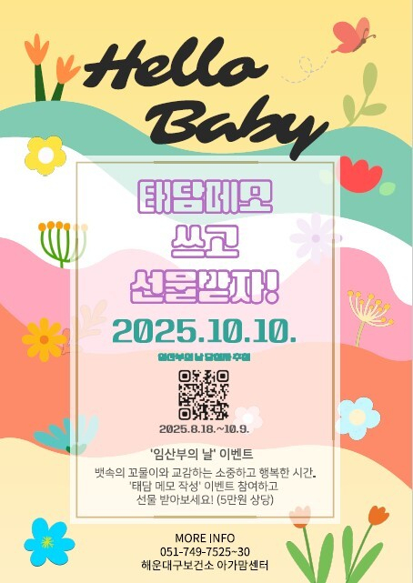 이번 이벤트는 임산부의 날의 의미를 되새기고, 뱃속 아기와 교감하는 소중한 시간을 제공하며 건강한 출산을 응원하기 위해 마련됐다. 참여는 8월 18일부터 10월 9일까지 가능하며, QR코드를 통해 온라인으로 태담 메모를 작성하면 된다. 참여자 중 100명을 추첨해 5만 원 상당의 출산 지원 용품을 선물할 예정이다.