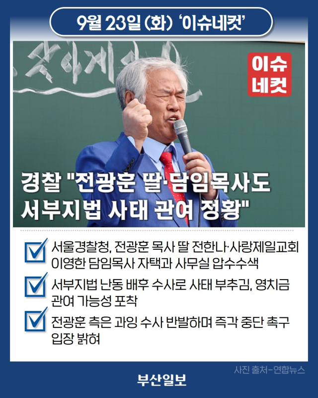 서울경찰청 안보수사대가 서부지법 난동 사태의 배후를 수사하는 과정에서 전광훈 목사의 딸 전한나 씨와 사랑제일교회 이영한 담임목사의 자택과 사무실을 압수수색했습니다. 경찰은 두 사람의 휴대전화와 PC, 관련 문건 등을 확보한 것으로 알려졌습니다. 경찰은 전 목사가 서부지법 사태의 배후가 아닌지 조사하는 과정에서 딸 한나 씨가 이 사태를 부추기거나 체포·구속된 인사들에게 영치금을 보내는 데 관여했을 가능성을 포착한 것으로 전해졌습니다. 이 목사 역시 전광훈 목사의 지시를 전달하는 역할을 했다는 의혹이 불거진 바 있습니다. 서부지법 사태는 지난 1월 윤석열 전 대통령 구속에 반발한 지지자들이 법원에 난입해 폭력을 행사한 사건입니다. 전 목사가 이끄는 대한민국바로세우기국민운동본부(대국본)는 이날도 입장문을 내고 "억지로 사건을 만들어내고 근거 없는 의혹을 확대 재생산하는 여론몰이 수사는 정의가 아니다"라며 "더 이상의 과잉 수사는 즉각 중단돼야 한다"고 반발했습니다.