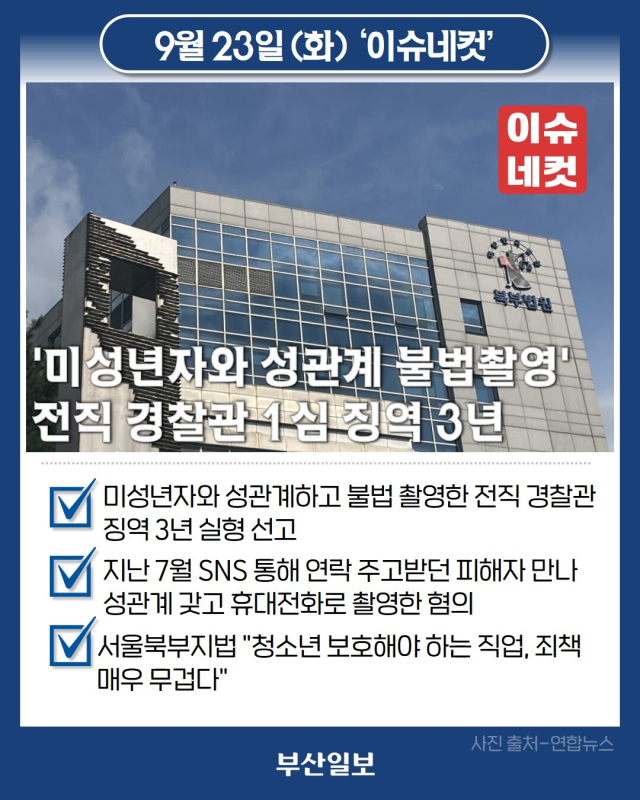 미성년자와 성관계하고 이를 불법 촬영한 전직 경찰관이 실형을 선고받았습니다. 서울북부지법 형사합의13부(나상훈 부장판사)는 23일 청소년성보호법 위반 등의 혐의로 재판에 넘겨진 A(32) 씨에게 징역 3년을 선고하고 40시간의 성폭력 치료 프로그램 이수와 5년간 아동·청소년·장애인 관련 기관 취업제한을 명령했습니다. 재판부는 "청소년을 보호해야 하는 직업을 가졌음에도 이 같은 범행을 저질러 죄책이 매우 무겁다"고 밝혔습니다. 다만 피해자가 성년이 된 후 공탁금을 수령하겠다는 의사를 표하고, A 씨에 대한 중한 형사처벌은 바라지 않는다는 점을 고려했다고 설명했습니다. 인천 논현경찰서 소속이었던 A 씨는 지난해 7월 SNS를 통해 연락을 주고받던 피해자를 만나 성관계를 갖고 휴대전화로 촬영한 혐의로 재판에 넘겨졌습니다.