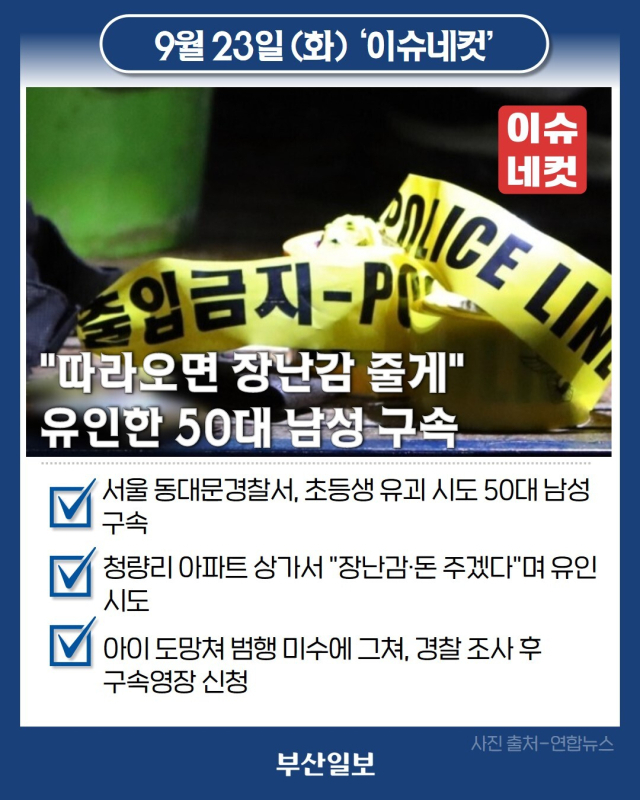 서울 동대문경찰서는 초등학생 여아를 유괴하려 한 혐의로 50대 남성 A 씨를 구속했다고 23일 밝혔습니다. 경찰에 따르면 A 씨는 지난 20일 오후 5시께 동대문구 청량리동의 한 아파트 상가 앞에서 친구들과 놀고 있던 9세 여아에게 다가가 "따라오면 장난감과 돈을 주겠다"며 유인한 혐의를 받고 있습니다. 아이가 A 씨를 피해 현장에서 달아나면서 실제 범행으로 이어지진 않았습니다. 보호자 신고를 받고 출동한 경찰은 주거지에서 A 씨를 체포하고 이튿날 구속영장을 신청했습니다. 경찰은 A 씨를 상대로 정확한 범행 동기를 조사 중입니다.