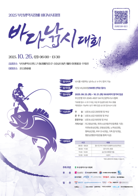 부산광역시낚시협회(회장 김선관)가 주관한 ‘2025 부산광역시장배 바다낚시대회’가 오는 10월 26일 부산 영도구 조도방파제 일원에서 개최된다.