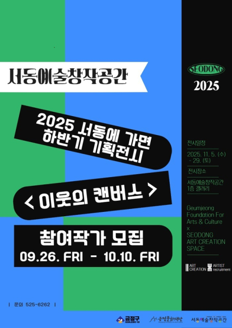 부산 금정구 금정문화재단(이사장 윤일현)은 오는 11월 5일부터 열리는 서동예술창작공간 하반기 기획전시 서동에 가면 ‘이웃의 캔버스’ 전시에 참여할 작가를 9월 26일부터 내달 10일까지 모집한다고 밝혔다.