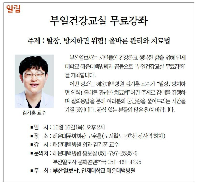 부산일보사는 시민들의 건강하고 행복한 삶을 위해 인제대학교 해운대백병원과 공동으로 '부일건강교실 무료강좌'를 개최합니다.
