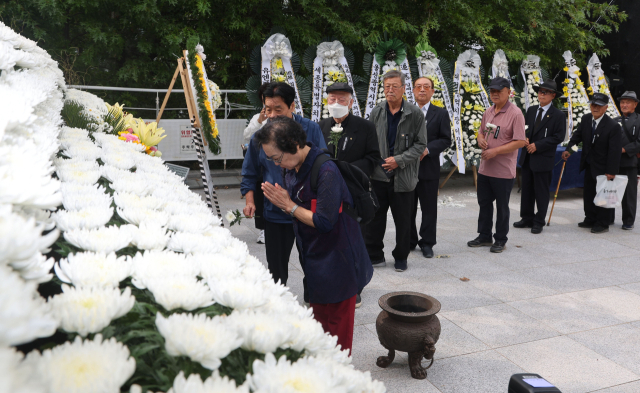 29일 오후 부산 남구 대연동 국립일제강제동원역사관 추모 공원에서 열린 ‘2025 일제 강제 동원 희생자 전국 합동위령제’에서 유가족과 참석자들이 강제 동원 희생자를 추모하며 헌화하고 있다.