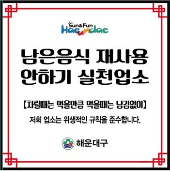 김성수 해운대구청장은 “많은 음식점이 남은 음식 재사용 금지 운동에 동참해 소비자의 불안감을 해소하고, 안전한 식생활 문화가 정착될 수 있도록 위생점검과 홍보를 지속해 나가겠다”고 밝혔다.