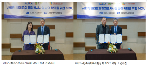 코이카(KOICA‧한국국제협력단)는 1일 오후 경기도 성남시 코이카 본부에서 한국건강가정진흥원(KIFH) 및 한국사회복지관협회(KASWC) 두 기관과 각각 ‘사회적 배려층의 해외봉사사업 참여 확대를 위한 업무협약’을 체결했다.