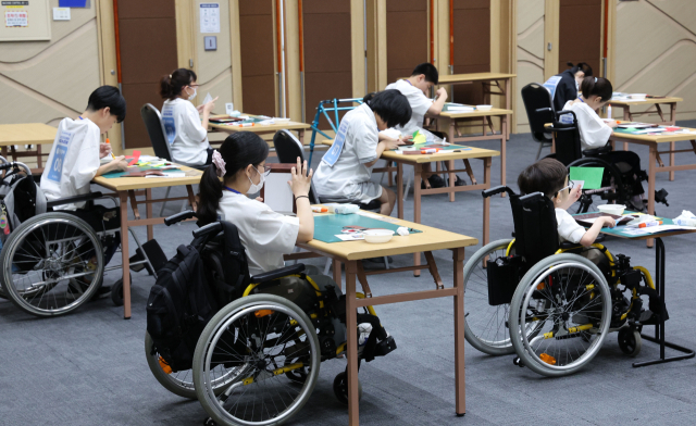 1일 부산 동구 부산항국제전시컨벤션센터에서 열린 ‘2025 전국 장애 학생 직업기능 경진대회’에서 한지공예 부문 참가자들이 작품을 만들고 있다. 이번 대회는 전국 17개 시도에서 선발된 특수학교 학생들이 제과제빵, 시각디자인, 점역교정 등 4개 분과 13개 종목에서 기량을 겨뤘다.