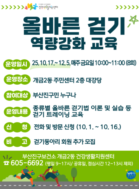 종류별 올바른 걷기 방법 이론 및 실습 등 걷기 트레이닝 교육을 오는 10월 17일부터 12월 5일까지 매주 금요일 오전 10시부터 11시까지 총 8회차로 개금2동 주민센터 2층 대강당에서 진행할 예정이다.