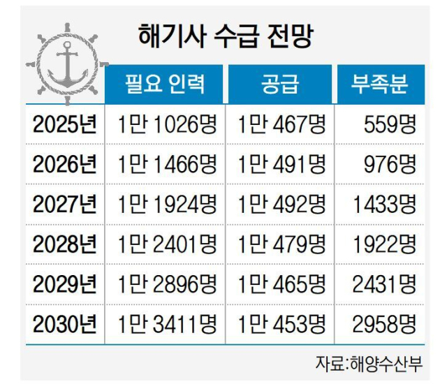 실제 해기 인력 부족은 해마다 심화하고 있다. 해양수산부의 ‘제2차 선원 정책 기본계획’에 따르면 올해 해기사 수요는 1만 1026명인 반면 내국인 공급은 7985명에 불과하다. 외국인 공급(3596명)을 합쳐도 559명이 부족하다.