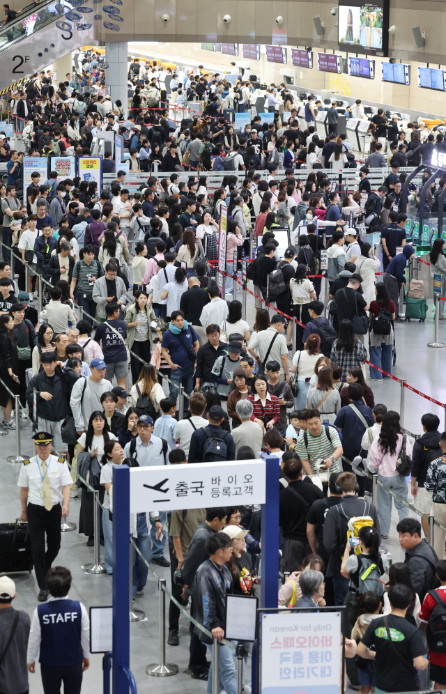 최장 10일간 이어지는 추석 황금연휴를 앞둔 2일 오전 부산 강서구 김해국제공항 국제선 청사가 해외로 떠나려는 여행객들로 붐비고 있다.