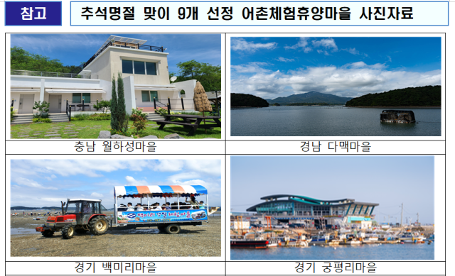 다맥마을(경남 사천시)은 한려해상국립공원 중앙에 위치해 갯벌체험과 어촌 활동을 경험하고, 숙박시설 앞에 체육시설이 있어 가족과 안전하게 즐거운 시간을 보내기 안성마춤이다. 백미리마을(경기 화성시)은 추석 연휴에만 운영되는 맨손잡이 체험과 망둥어 낚시 체험 등 아이들이 직접 잡아보는 재미를 느낄 수 있다.