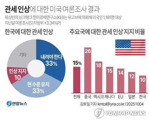 한국에 대한 관세를 올려야 한다고 생각하는 미국인은 10명 중 1명에 불과하고, 반대로 내려야 한다고 보는 사람은 10명 중 약 3명이라는 여론조사 결과가 나왔다.