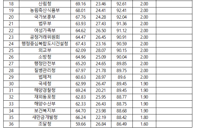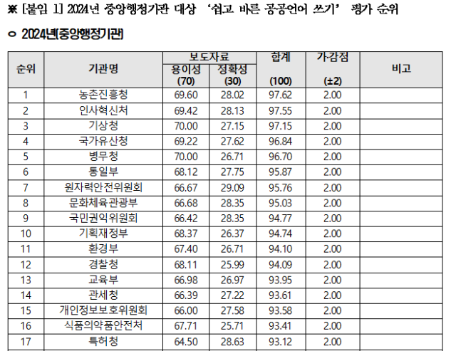 산업부는 중앙행정기관 공공언어 평가결과 2021년 42위, 2022년 44위에서 2023년 32위로 일시 반등했으나 2024년 다시 44위로 내려 앉으며 행정각부 중에서 꼴찌를 기록했다. 통계청은 2024년 73.06점으로 46개 중앙행정기관 중 꼴찌를 기록했다. 금융위원회도 77.78점으로 45위에 그쳤다.