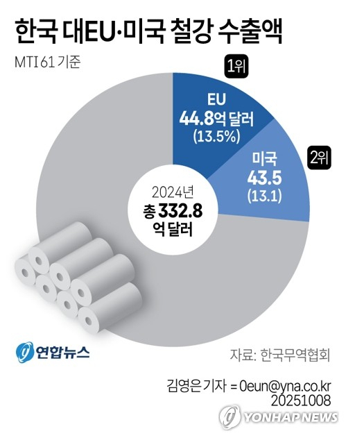 한국무역협회에 따르면 작년 한국의 EU 철강 수출(MTI 61 기준)은 44억 8000만 달러(약 6조 3000억 원) 규모로, 단일국가 기준 1위 수출시장인 미국(43억 5000만 달러)과 1·2위를 다투는 수준이다.