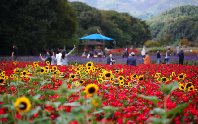 추석 연휴 마지막 날인 9일 경남 함양군 상림공원꽃단지에서 시민들이 꽃 구경을 하며 즐거운 시간을 보내고 있다. 연합뉴스