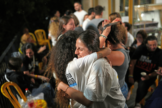 팔레스타인 무장정파 하마스에 억류된 이스라엘 인질의 가족들이 ‘가자 평화 구상’ 1단계 합의 소식이 전해진 9일(현지 시간) 이스라엘 텔아비브 인질 광장에서 서로를 끌어안으며 기뻐하고 있다. AP연합뉴스