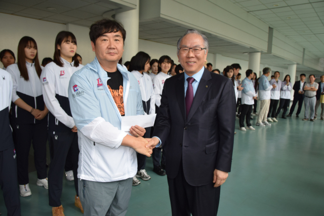 12일 부산 강서구 체육관에서 열린 전국체육대회 부산시 태권도 선수단 결단식 현장에서 최찬기 회장은 직접 후원금을 전달하며, 경기 출전을 앞둔 선수들과 임원진을 격려했다.