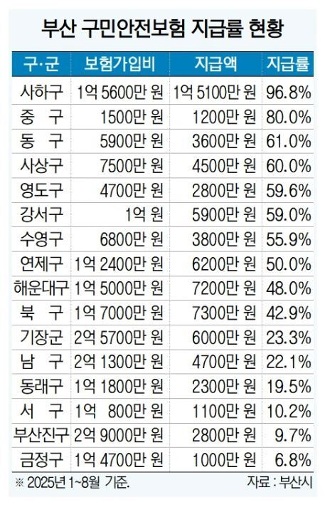 12일 부산시에 따르면 지난 8월 기준 부산 지역 구민안전보험 지급률(가입비 대비 총지급액) 편차는 최대 90%포인트(P)다. 사하구가 보험료 1억 5600만 원 중 지급액 1억 5100만 원(96.8%)으로 가장 높았고, 금정구가 1억 4700만 원 중 1000만 원(6.8%)으로 가장 낮았다.