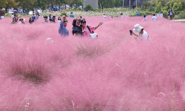 12일 오후 부산 강서구 대저생태공원을 찾은 시민들이 분홍색 서양 억새의 일종인 핑크뮬리 단지에서 사진을 찍으며 휴일을 보내고 있다. 낙동강 관리본부가 조성한 핑크뮬리 군락지는 대저생태공원 2번 주차장 인근에 넓게 펼쳐져 있다.