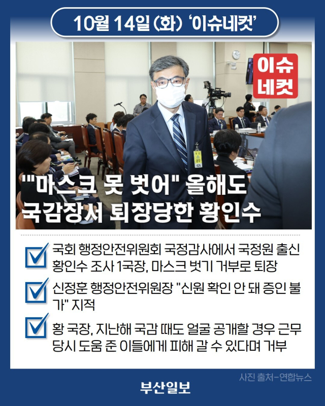 2기 진실·화해를 위한 과거사 정리위원회(진실화해위)의 국가정보원 출신 간부가 14일 국회 행정안전위원회 국정감사에서 마스크를 벗으라는 요구에 응하지 않아 퇴장을 당했습니다. 더불어민주당 소속 신정훈 행정안전위원장은 이날 국감에서 마스크 벗기를 거부한 황인수 조사1국장에게 "신원이 확인되지 않는 분은 우리 위원회 기관 증인으로 없다"며 회의장 밖 대기를 명령했는데요. 황 국장은 지난해 국감 때도 얼굴을 공개할 경우 국정원 근무 당시 도움을 준 이들에게 피해가 갈 수 있다며 마스크 착용을 고수하다 퇴장을 당했습니다. 신 위원장은 국가공무원법과 대법원 판례 등을 언급하며 "마스크를 착용하는 것은 국회 증언을 하는 증인으로서 온당한 자세가 아닐 뿐 아니라 국가공무원으로서 갖춰야 할 최소한의 품위, 의무 이행에 있어 부적절·불합리하다"고 지적했는데요. 박선영 진실화해위원장은 신 위원장의 요구에 따라 "다시 한번 생각해 봐달라"며 황 국장에게 마스크를 벗어달라 요청했으나 황 국장은 "송구하다"며 거부 의사를 밝혔습니다.