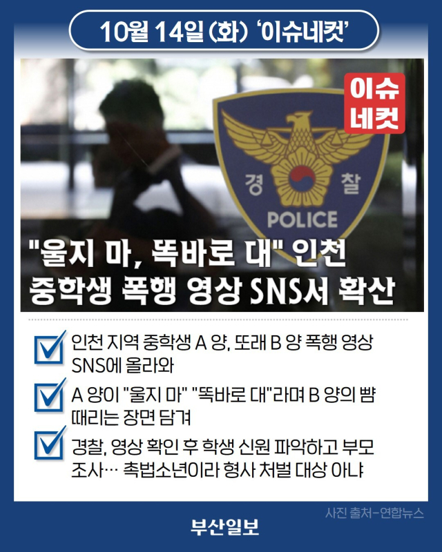 SNS에 인천 지역 중학생이 다른 중학생을 폭행하는 영상이 올라와 경찰이 수사에 나섰습니다. 14일 인천 연수경찰서에 따르면 이달 초 연수구 한 건물에서 중학생 A 양이 다른 중학생 B 양을 3차례에 걸쳐 폭행하는 영상이 SNS에 공유됐습니다. 영상에는 A 양이 "울지 마"라거나 "똑바로 대"라며 B 양의 뺨을 때리는 장면이 담겨 있었습니다. 경찰은 온라인 상에 퍼진 폭행 영상을 확인하고 두 학생의 신원을 특정한 뒤 양측 부모를 상대로 사실관계를 파악했습니다. A 양은 만 10세 이상 14세 미만의 촉법소년이어서 형사 책임을 물을 수는 없는 것으로 확인됐습니다.