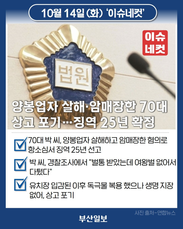양봉업자를 살해하고 시신을 암매장해 지난 1일 열린 항소심에서 징역 25년을 선고받은 70대 박 모 씨가 상고를 포기했습니다. 박 씨는 설 연휴 임시공휴일인 올해 1월 27일 정읍시 북면에 있는 한 움막에서 지인 A(77) 씨를 둔기로 여러 차례 때려 살해하고 시신을 인근 야산에 묻은 혐의로 기소됐습니다. 부검 결과 A 씨의 폐와 기도에서는 흙이 발견됐는데 이는 A 씨가 매장될 당시 미약하게나마 호흡이 남아있던 증거라고 항소심 재판부는 설명했습니다. 박 씨는 경찰 조사에서 "양봉업자인 A 씨가 과거에 벌통을 팔았는데 여왕벌이 없었다"며 "여왕벌을 얻으러 왔다가 그와 다퉜다"고 피해자에게 책임을 떠넘기기도 했습니다. 그는 유치장에 입감된 이후 속옷에 숨겨둔 독극물을 마셔 병원으로 옮겨졌지만, 생명에는 지장이 없어 예정대로 법의 심판을 받게 됐습니다.